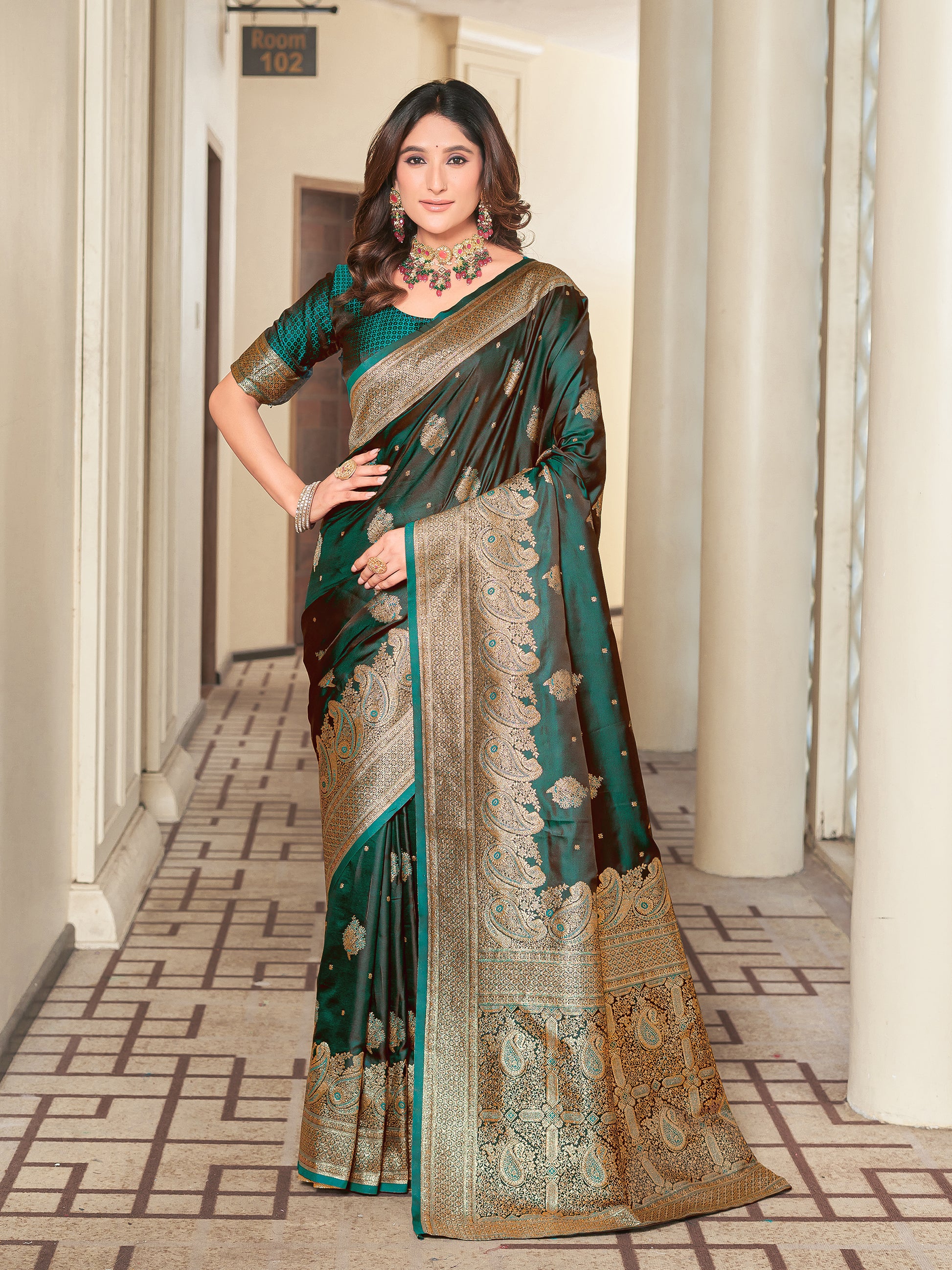 Woven Banarasi Jacquard, Satin Silk Blend Saree With Unstitched Blouse (Green)