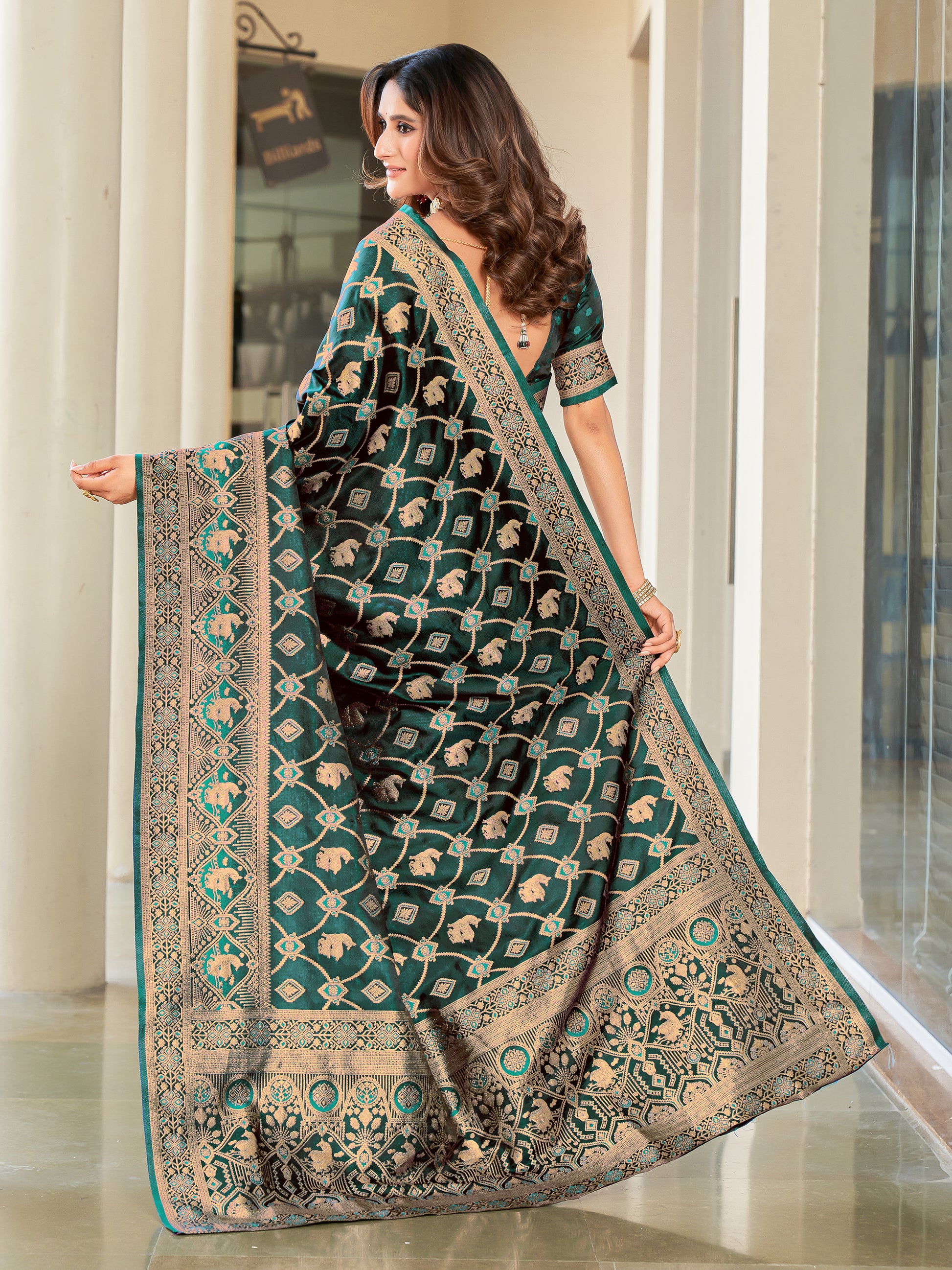 Woven Banarasi Jacquard, Satin Silk Blend Saree With Unstitched Blouse (Green)