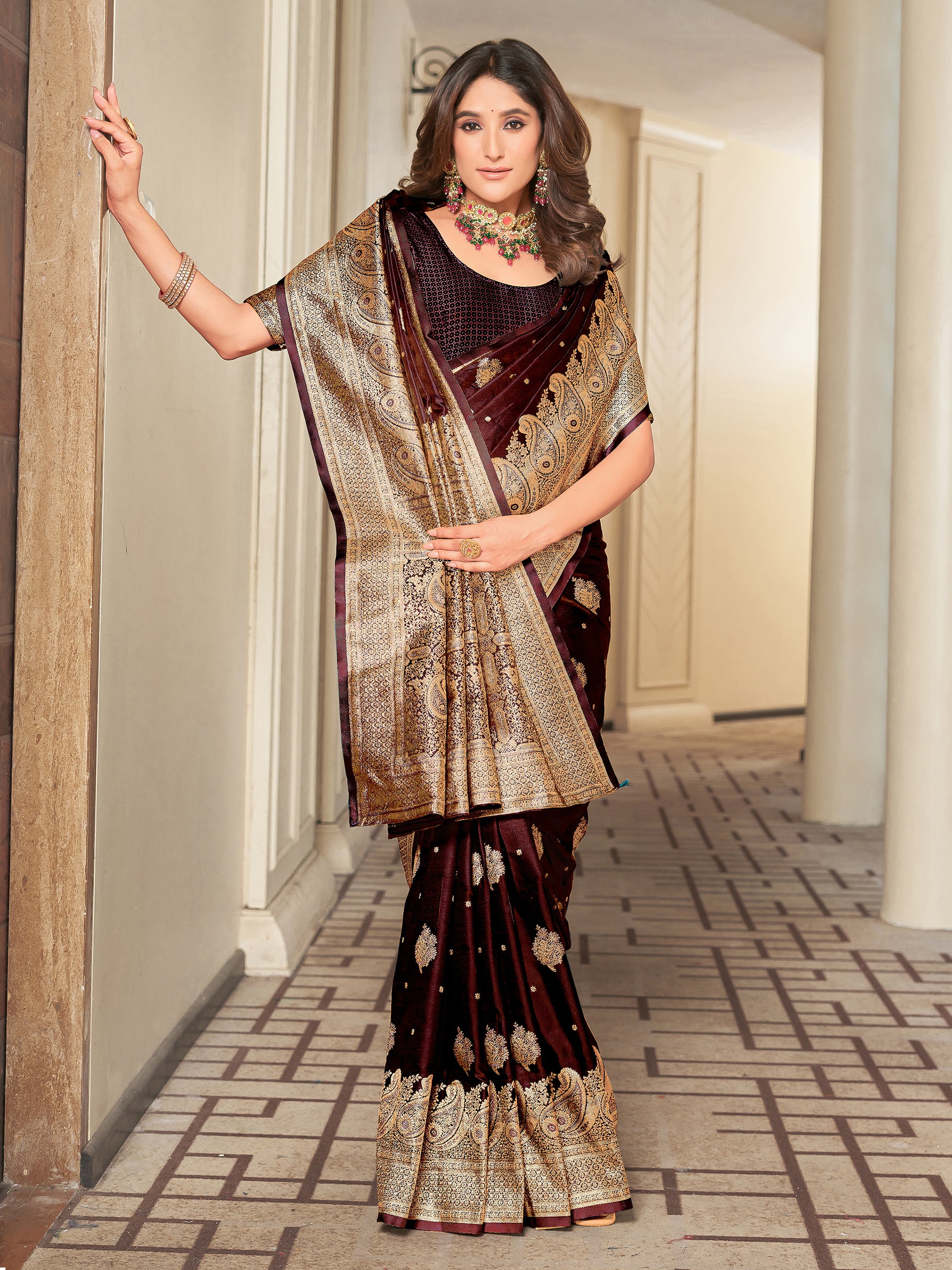 Woven Banarasi Jacquard, Satin Silk Blend Saree With Unstitched Blouse (Maroon)