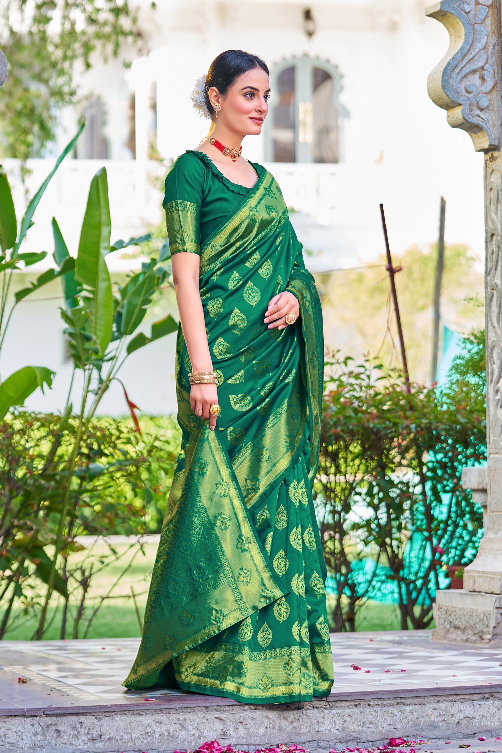 Woven Banarasi Jacquard, Silk Blend Saree With Unstitched Blouse (Rama Green)